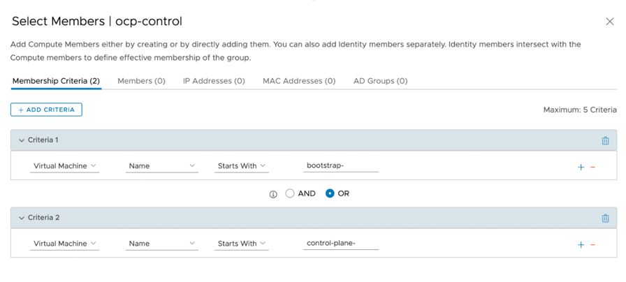 for Load Balancing, NSX-T Load Balancer could be used. We will need to create two Active Monitors, two Server Pools, and two Load Balancing VIPs with the same IP address. One for TCP-6443, and another one for TCP-22623. We can use NSX-T Dynamic Group Membership to configure the Server Pools as shown in below example.