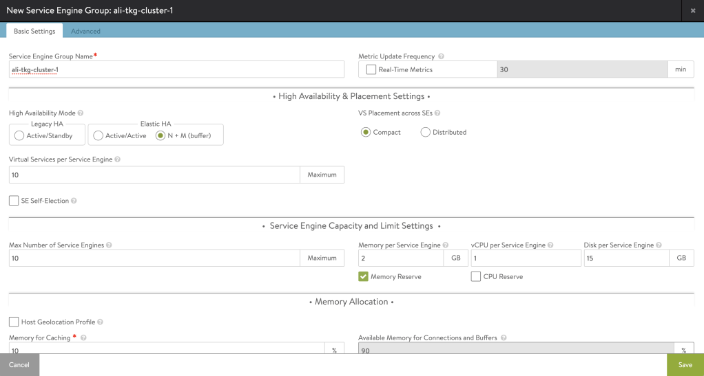 Infrastructure >> Service Engine Group >> CREATE
