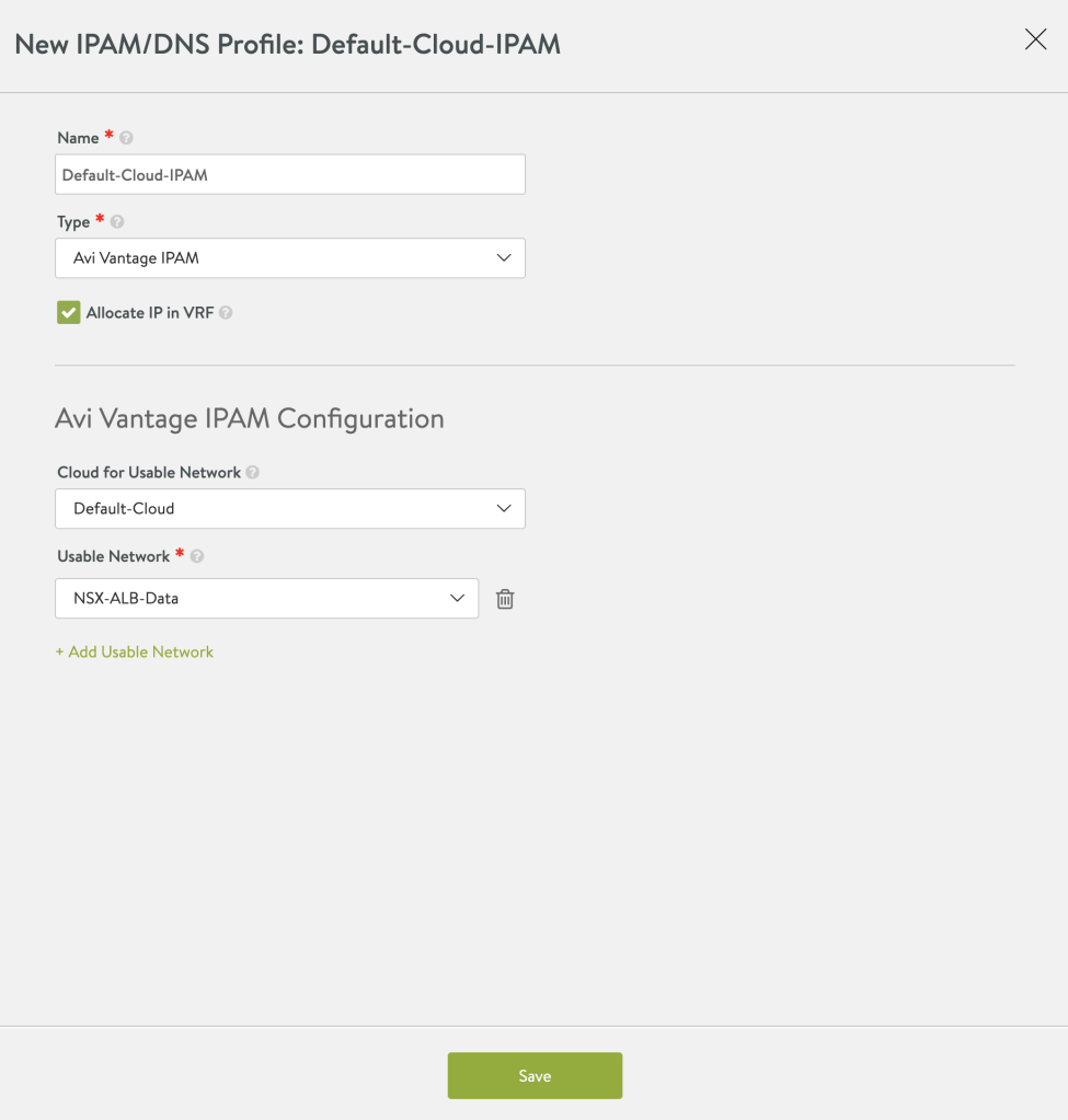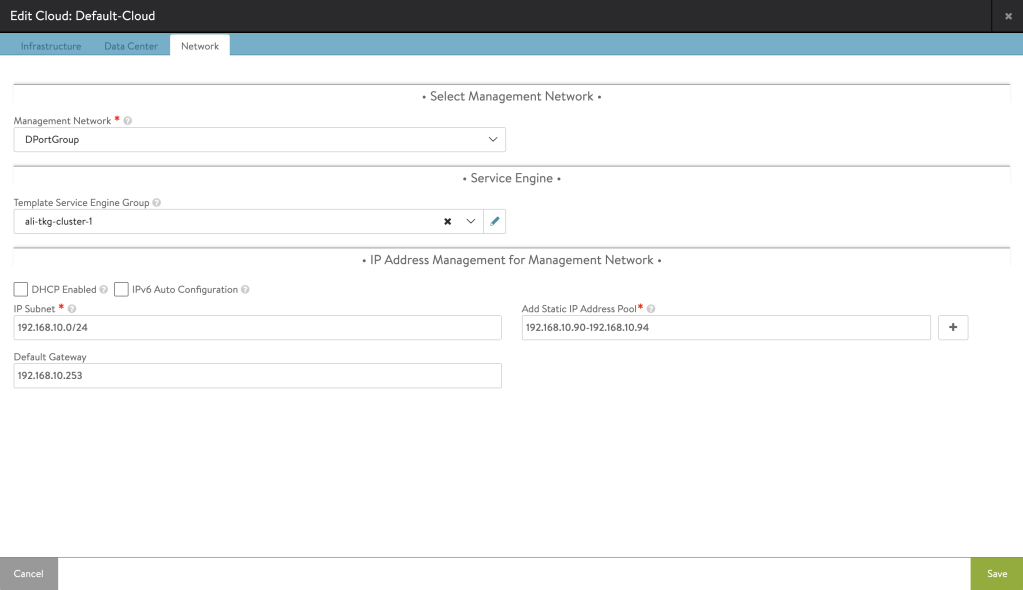 Even though I have NSX-T in my environment, and i am using NSX-T for the SE connectivity, I am using the Default-Cloud which is a vCenter Cloud. I am doing that because AKO does not support NSX-T Cloud yet when this post is being written.