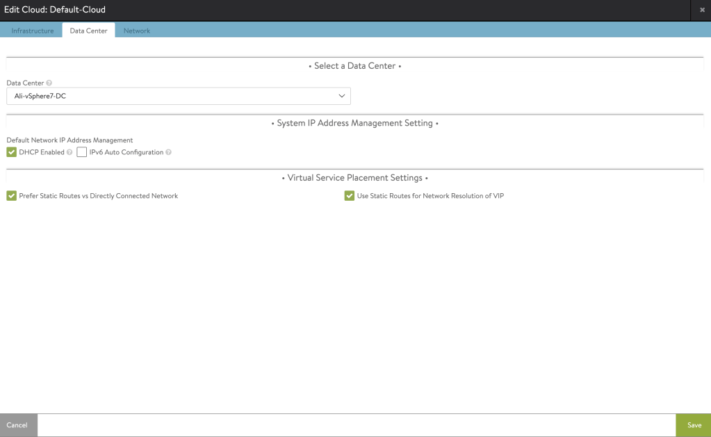 While we are in the Default-Cloud, let’s go to the Data Center tab to Enable three things, DHCP, Prefer Static Routes vs Directly Connected Network, and Use Static Routes for Network Resolution of VIP.