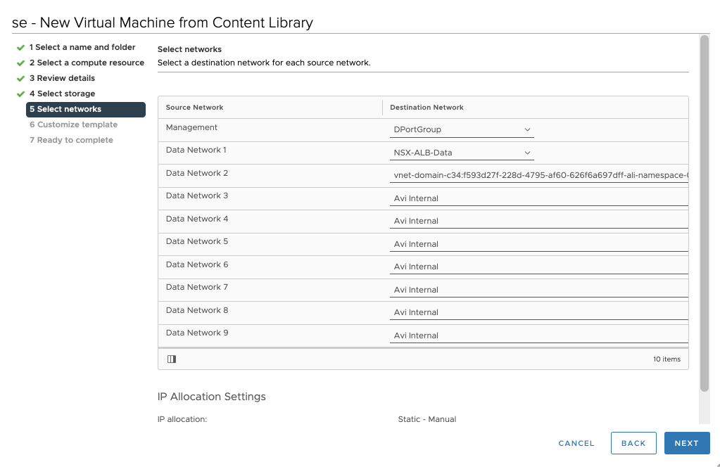 In the Network tap select the Management Network of the SEs. I am using a VDS dPG, but an NSX-T Overlay could be used too