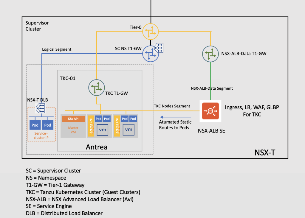 The main motivation for this exercise is to provide an Ingress Controller for TKCs. Today (vSphere 7.0U1) TKCs are using NSX-T for Service Type LoadBalancer, but they don’t ship with any Ingress Controller. NSX-ALB is an enterprise class Ingress Controller with GLSB and WAF capabilities and most probably it will become the default choice for ingress in vSphere with Tanzu and TKG in the future. I am using Antrea as a CNI for Pods Networking.