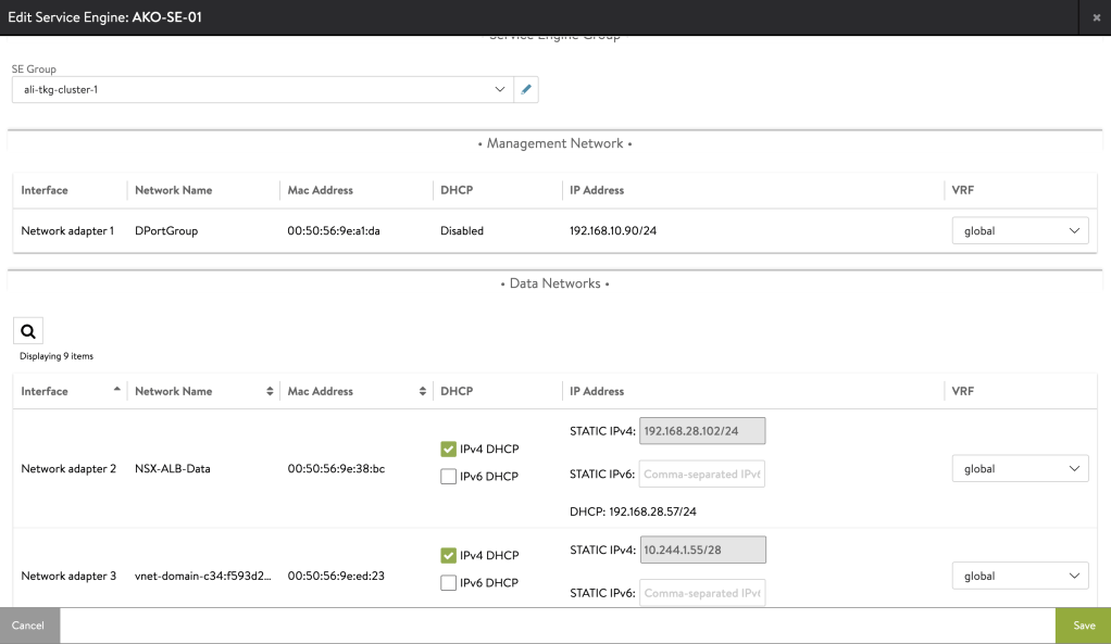 – Data Network 2: This is the NSX-T Overlay Segment that is used by the TKC nodes. It is very important to get this one right to have L2 connectivity to the K8s nodes. AKO will create static routes to reach the pods inside the nodes.