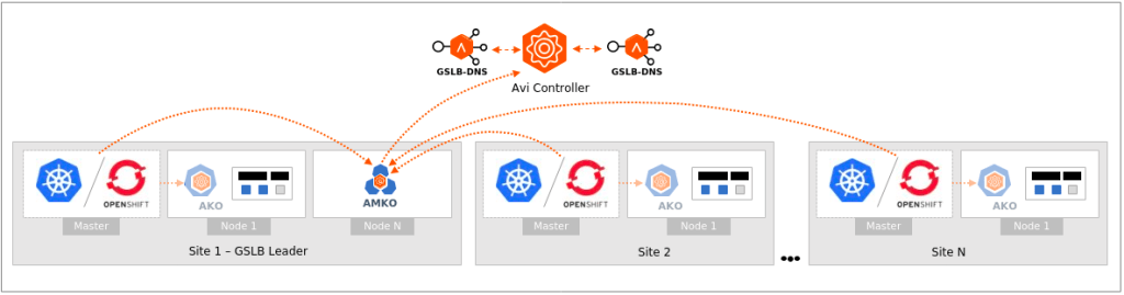 AMKO could be deployed in one or more clusters (federation) and it will watch K8s Ingress and Load Balancing entries to look for a selection criteria. If the criteria is matched, it will instruct NSX-ALB controller to create the GSLB entries.