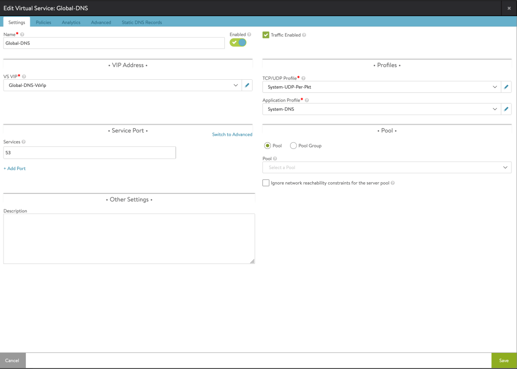 - Create Global-DNS Service. This service should be different than the one used for Local-DNS. You should delegate your Global Domain to this Virtual Service (or just point to it as your DNS Server).