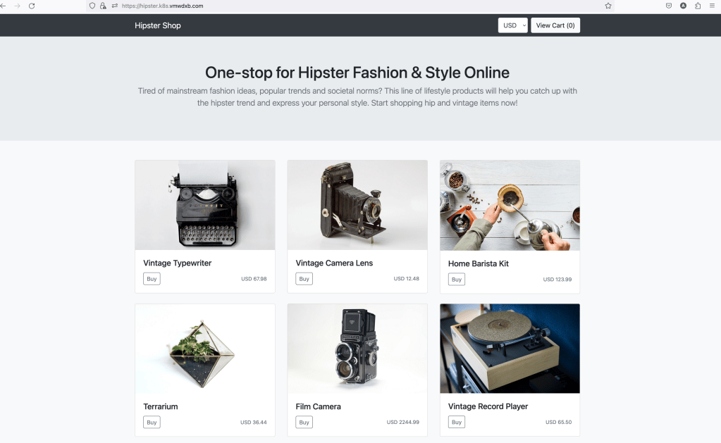 And we can access our application using the global FQDN (hipster.k8s.vmwdxb.com)